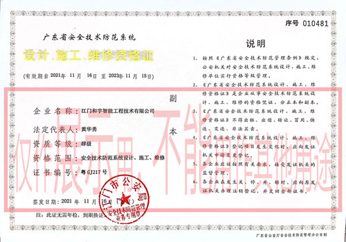 江門和宇智能工程技術(shù)有限公司注冊(cè)資金100萬(wàn),是一家獲得廣東省公安廳頒發(fā)<<廣東省安全技術(shù)防范系統(tǒng),設(shè)計(jì),施工,維修資格證>>的安防設(shè)計(jì),施工,維修于一體的企業(yè)。優(yōu)秀的員工,先進(jìn)的技術(shù),精良的設(shè)備,嚴(yán)格的管理是公司得以不斷發(fā)展養(yǎng)大、產(chǎn)品能夠贏得用戶依靠的根本所在。“可靠、專業(yè)”是我們生產(chǎn)精神和服務(wù)信念。